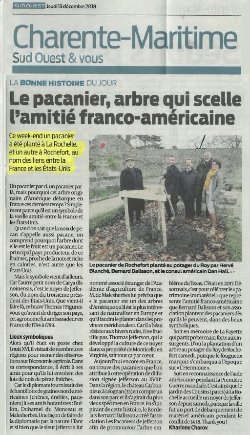 Planté le 8 décembre, 2018 dans le Potager du Roy en face de la Corderie Royale en attente de son emplacement définitive dans le Jardin de la Marine au bord de la Charente à l’achèvement des travaux en cours. Cet arbre est planté en souvenir de la construction de l’Hermione à Rochefort et du second voyage de La Fayette aux Etats-Unis en 1780.