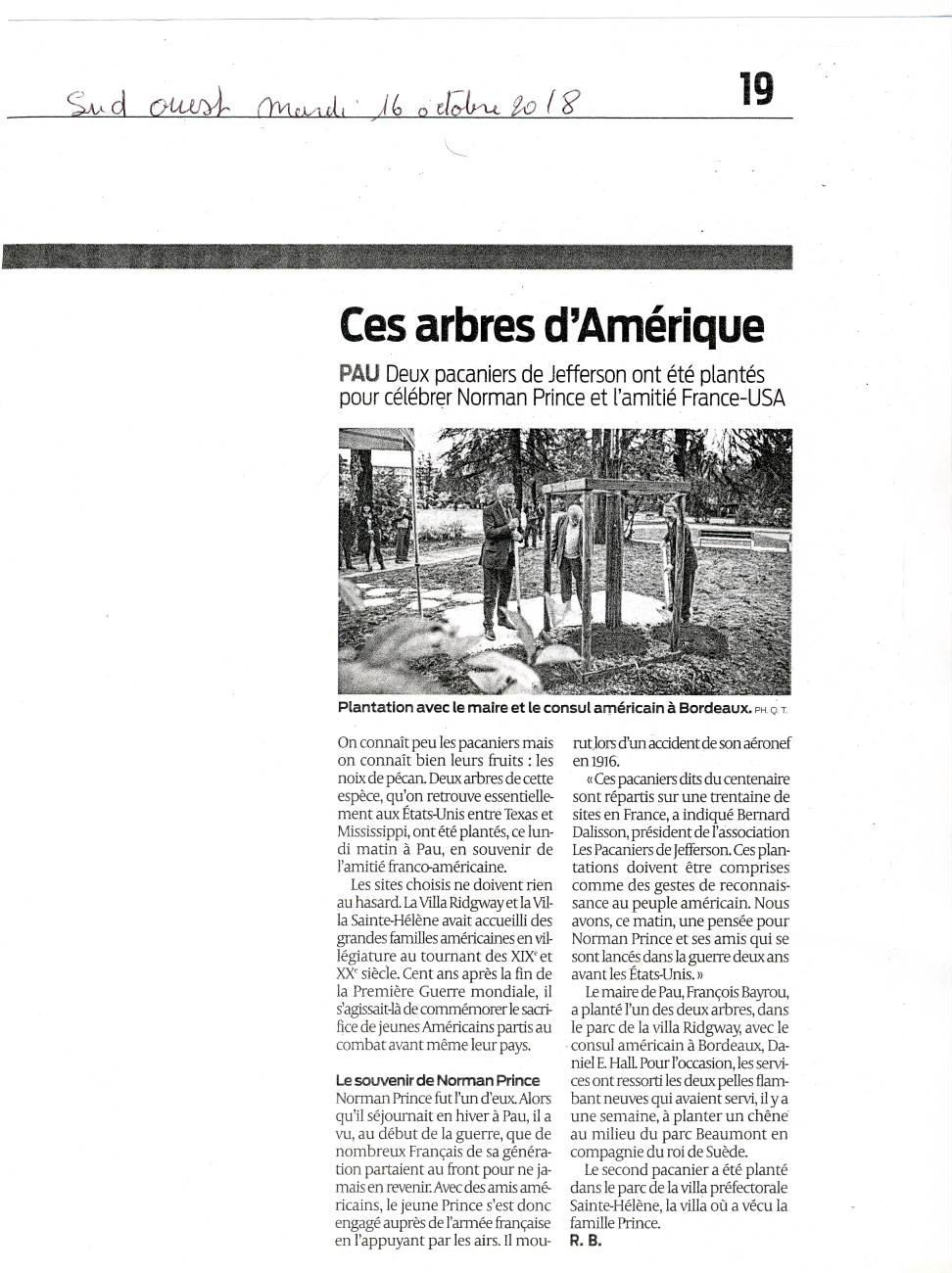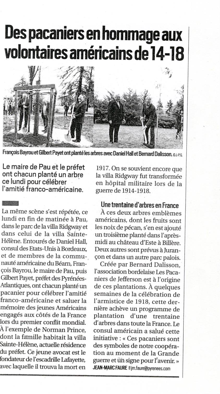 Le 15 octobre, 2018, deux plantations ont eu lieu à Pau. M Francois Bayrou, Maire de Pau, a planté ce jour un pacanier dans le parc de la Villa Ridgeway.